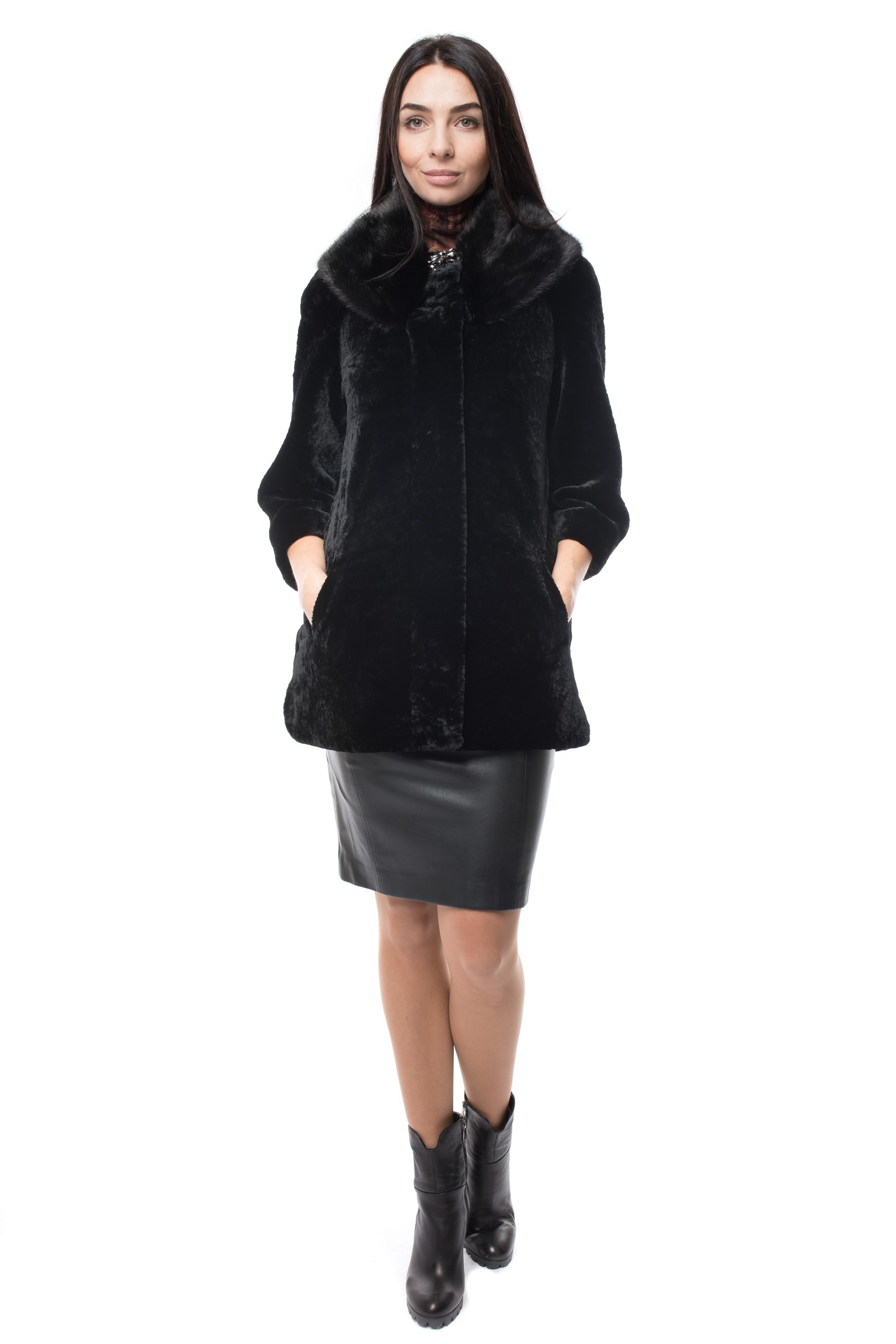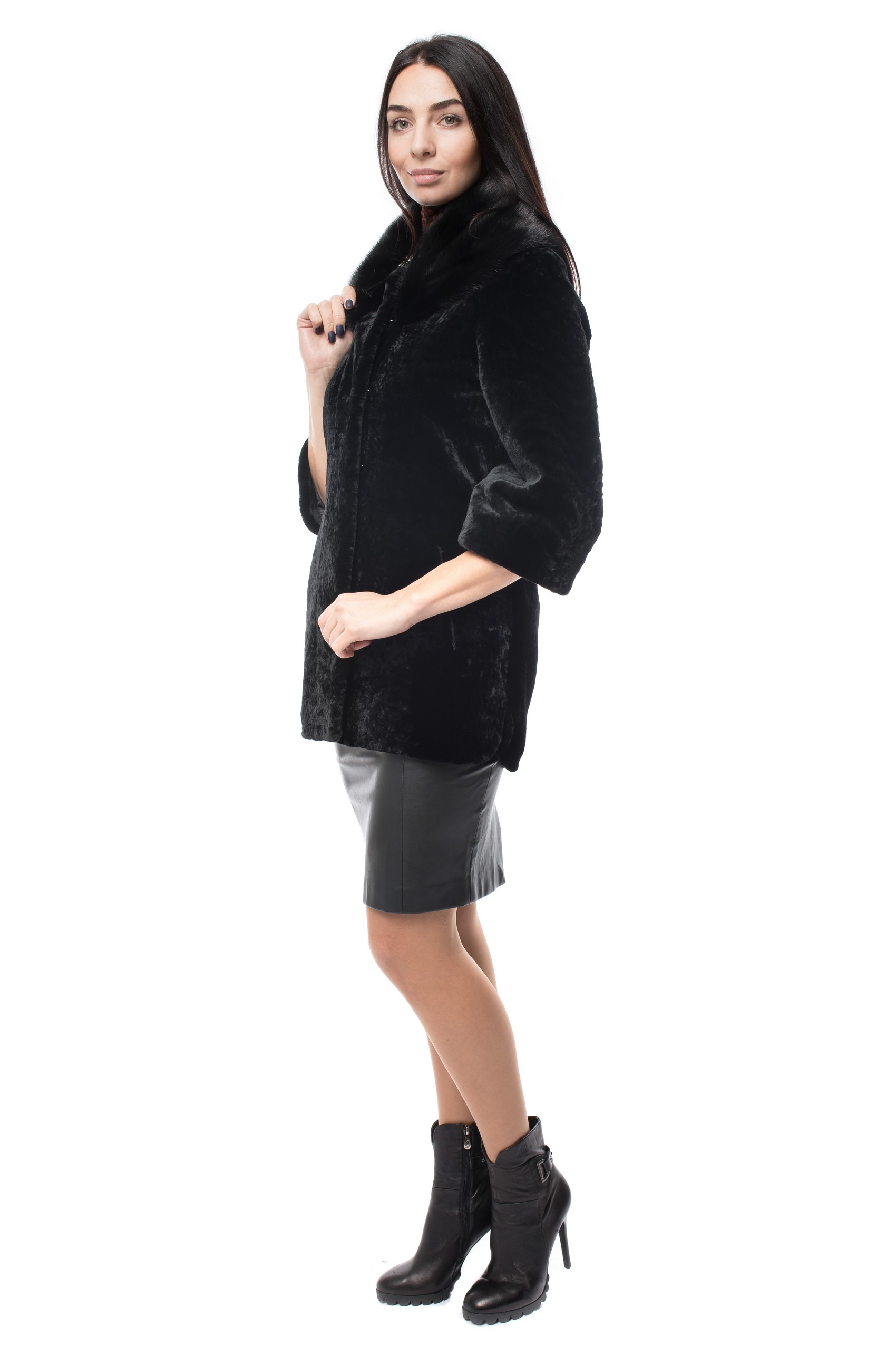 Куртка с верхом из натурального меха женская СМ ЕЛЕНА Е-79 натуральный мех-овчина,отделка - мех норки,подкладка-полиэстер крашенная 3/4 рукав